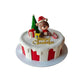 A chocolate sponge cake covered in fondant, topped with a crafted edible reindeer character and accented with artificial Christmas decorations to complete the festive holiday design.